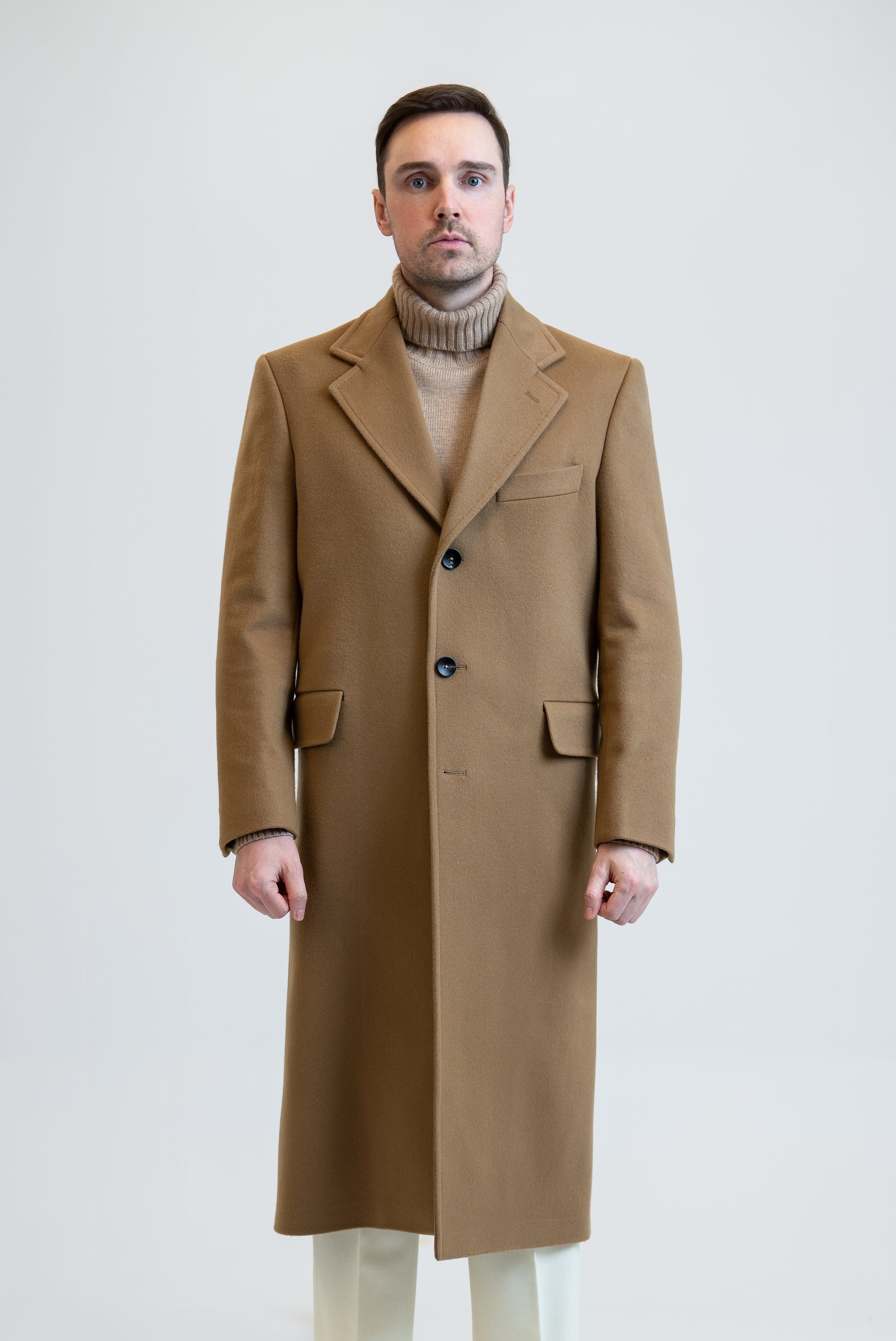 An Italian handmade, single-breasted camel coat. This piece is made from a luxurious cashmere-wool blend and is tailored to a regular fit.